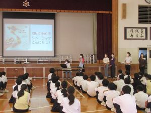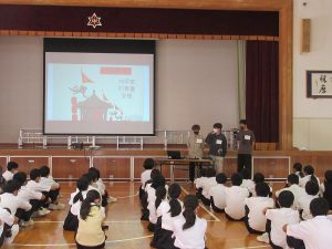 写真を用いて、国の挨拶や食べ物、有名な観光地などについて説明をしました。初めて触れる外国の習慣に驚きの声もあがりました。