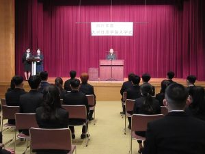 新入生代表挨拶では、何 鑫さんが留学生活に対する意気込みを話してくれました。