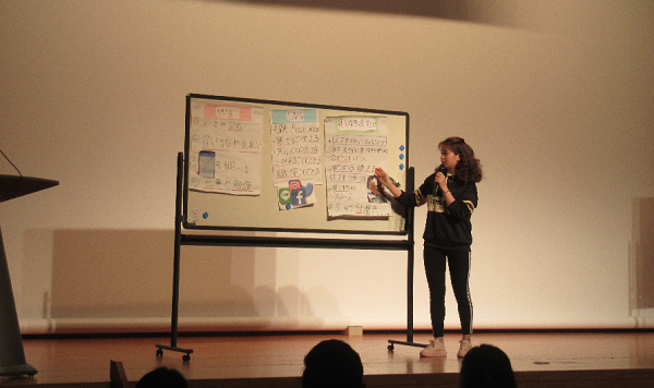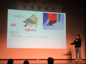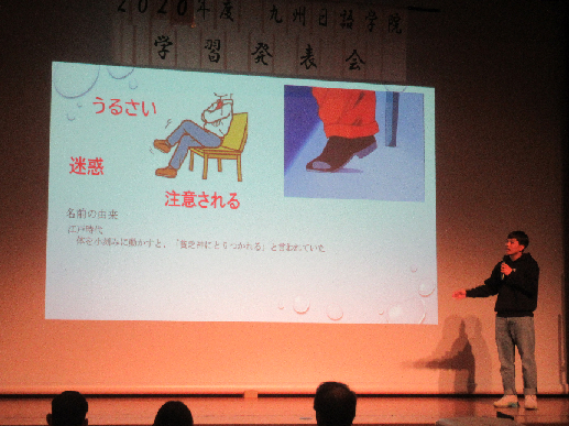 また、中級クラスは母国と日本の習慣の違い、一般的に悪いと言われているものの意外な効果、身近なもののいい点悪い点などについてプレゼンテーションしました。先輩たちの発表に1年生も真剣に聞き入っていました。