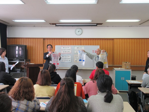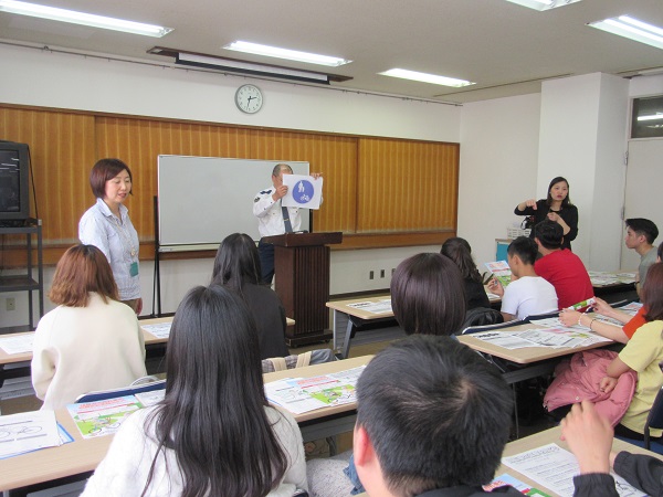 警察や区役所の方を招いて、交通ルールやゴミの分別について話をしていただきました。