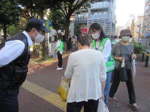 10月15日に南警察署より偽電話詐欺の対策の一環で、福岡銀行大橋支店に来店されるお客様や、銀行の前を通りかかる方々に、1人ずつ詐欺について注意を呼びかけながらチラシを配りました。